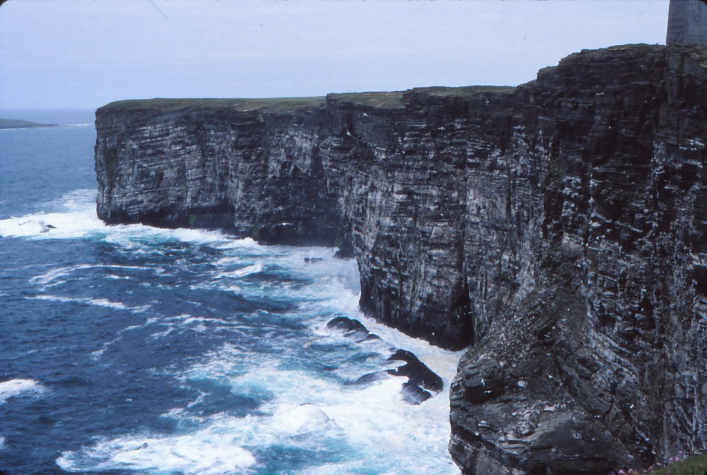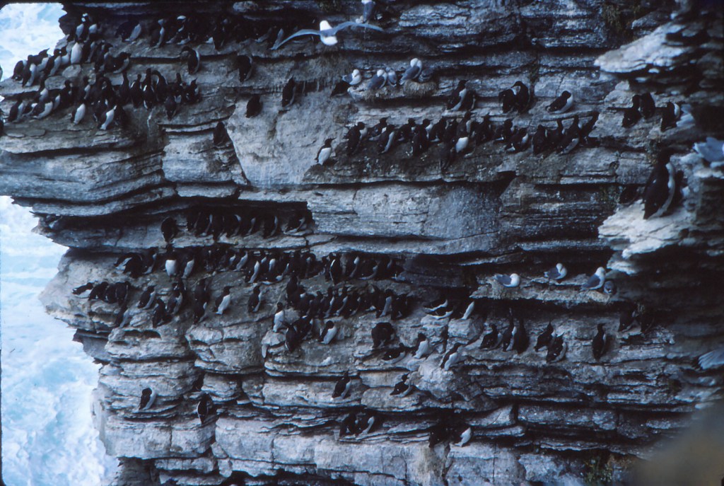 Later in summer 1983, I returned to Orkney to carry out what was then an annual monitoring programme of cliff-nesting seabirds. This had been established following concerns about the impact of the North Sea oil developments on seabirds. As it turned out, these concerns proved reasonably unfounded and the monitoring programme, both here and UK wide, has instead proven to be a good way of monitoring the changes in seabird populations linked to food supply, and in turn with ocean and climate change. My job in 1983 was though to visit each of five colonies ten times in the first three weeks of June. and to count pre-defined plots. There were daily time limits on this (to try to avoid known diurnal rhythms) so I would drive and hike hectically about to get the job done. One of the main colonies visited was Marwick Head, with some iconic views that contained the monitoring plots (there are at least seven plots in the main picture above).