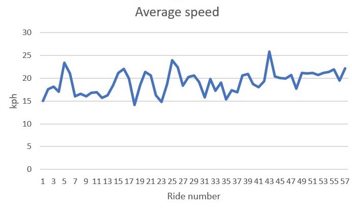 The highest maximum speed achieved was 58.78 kph (36.5 mph) on the way down from the highest point on the trip (Lecht towards Tomintoul). Highest speed depends as much on a reliably good road surface as anything else.