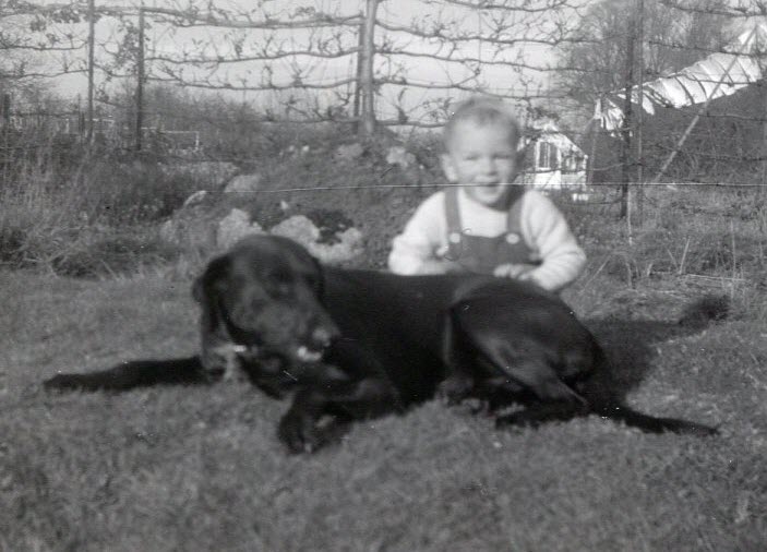 Our dog in those days was a big black cross between a Labrador and a greyhound. His name was Friday, because he joined the family on a Friday when we were in Redruth. When I say joined, he just followed Mum and myself (in a pram) home rom the town and despite advertising, his previous owner could not be found. Mum thinks that he might have been dumped. Friday was obviously fairly attached to me, and I was to him. A large proportion of the pictures of me from that era have Friday in them. He was obviously a bit of a lad – from Rood End he apparently used to commute to the pub by the brewery on an evening and was given a drink of beer. From Rood End this was about 500m away. This continued from 24 Ongar Road (3km) and from Old House (of which more shortly (4km)). He was also very attracted by female dogs on heat, and Dad had to go and collect him on several occasions from some distance away. One night he never came back and I remember being very sad that my friend had gone.