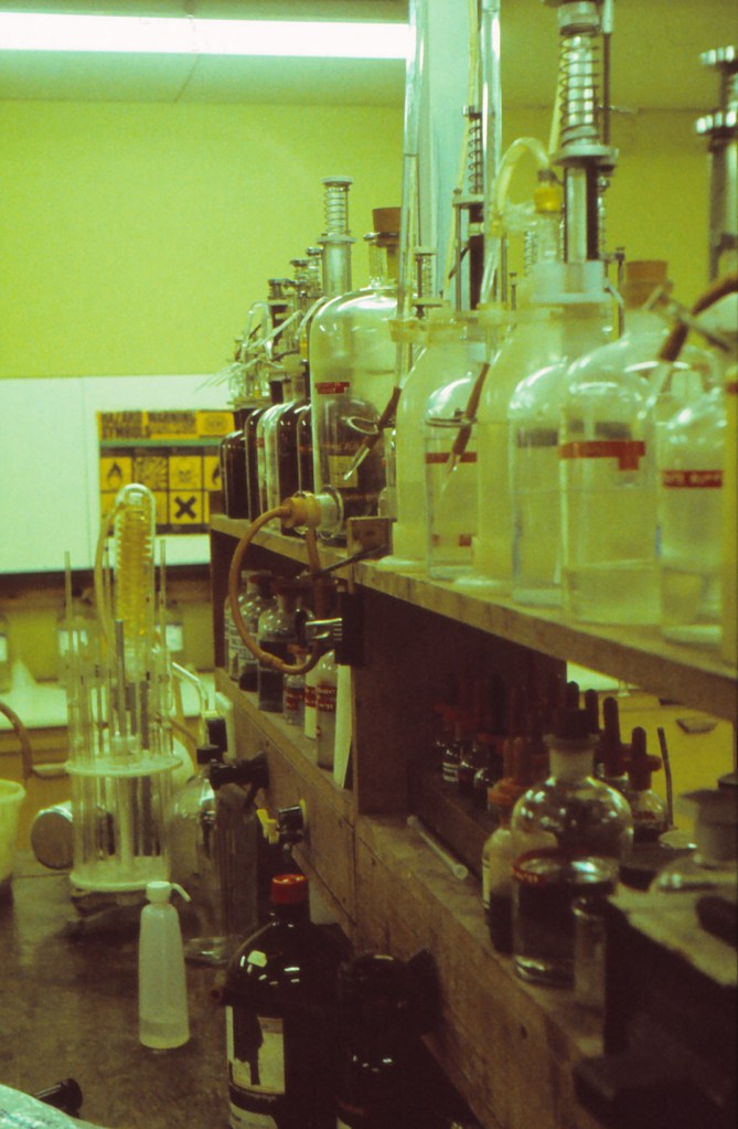 The lab bench where we did the tests to see how the refining process was going. Results were written onto large sheets that the supervisors and foremen would consult in order to decide how to tweak production. The idea was to get whiter than white sugar with a consistent crystal size. The “white” part was challenging as the beet picked up a lot of colouration from the local clay soils.