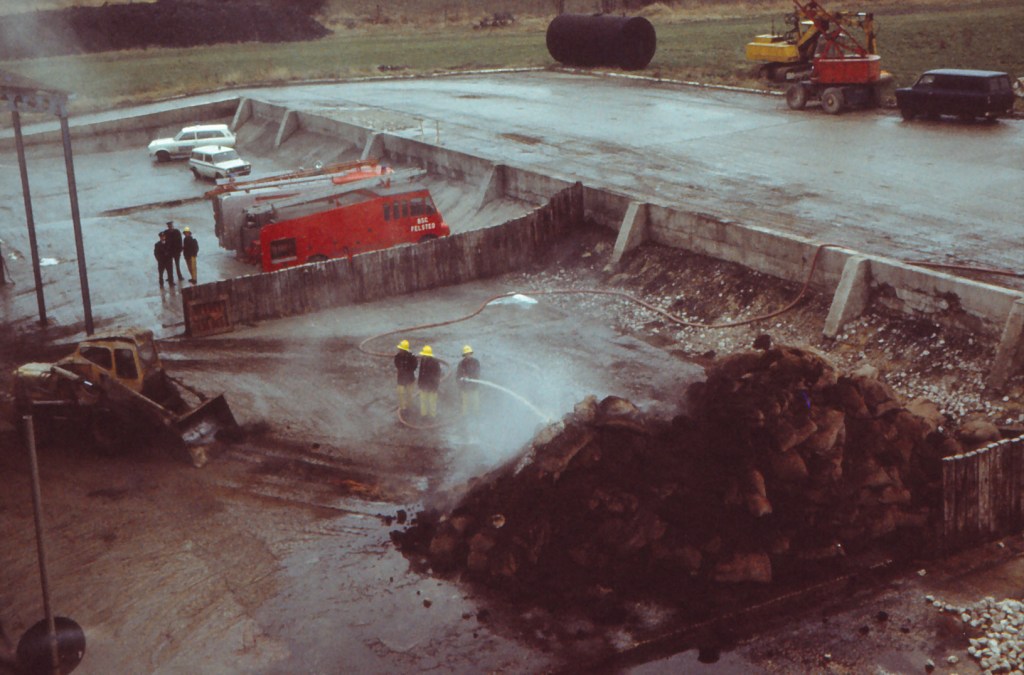 One of the by-products of sugar making was cattle food made from the left over fibre mixed with molasses. This was sold by weight, so there was a delicate balance between drying enough so that the pulp did not auto-combust, and drying too much so it was not as valuable. Needless-to-say another “product” of the factory were various unofficial hooch distilleries (as lab technicians we could access useful resources!). At Christmas, the product of one affected the production of the other – here is the fire brigade damping down the under-dried pulp pile….