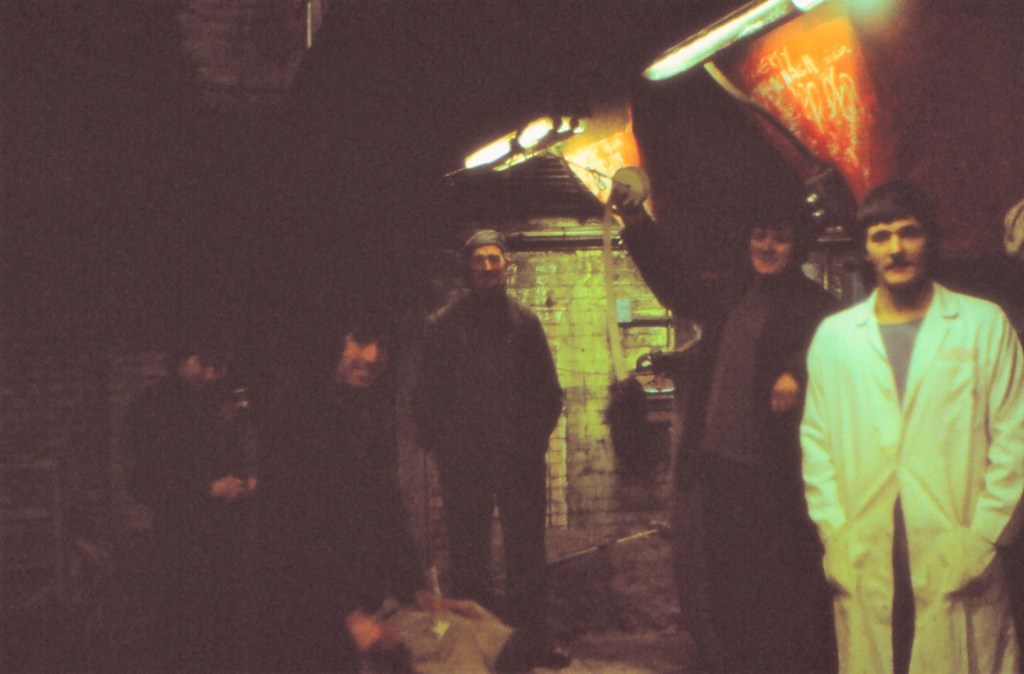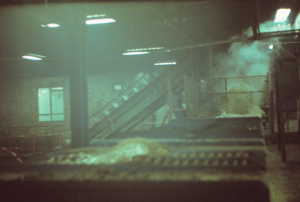 One of my favourite pictures – my workmates in the gloom of the factory. My co-shift chemist, Dave, is on the right in his lab coat