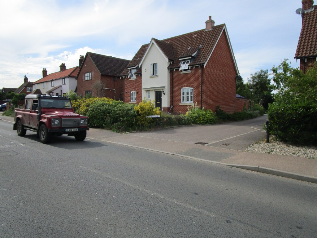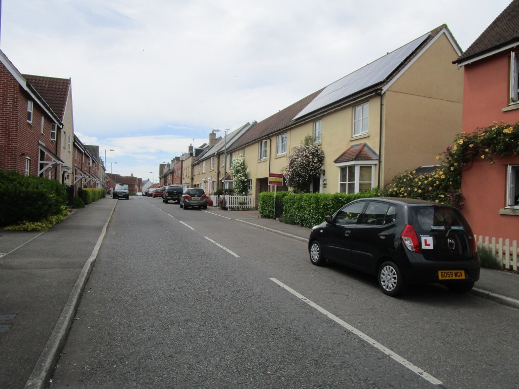 A road in Flitch Green – n attempt has been made to mix styles in a modern development and to keep narrow roads; however in a settlement of 2000+ people, there is only one small store, and one junior school – not really a village, nor self-sustaining. The gardens are minute.
