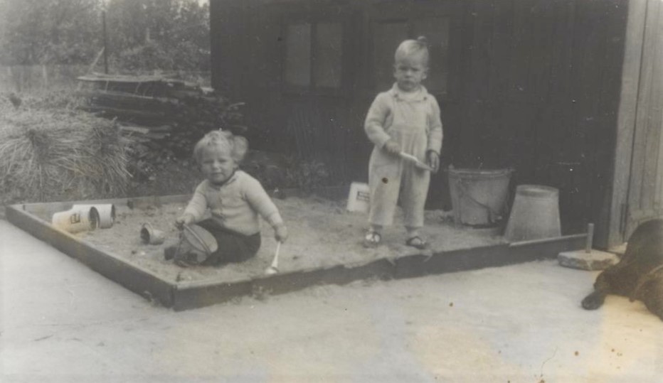Kay Stock and myself in the sandpit, playing “soolage” – my way of saying sewage. Normal boys and girls build sand-castles – we built sewage works – note the buckets and to the right: Friday