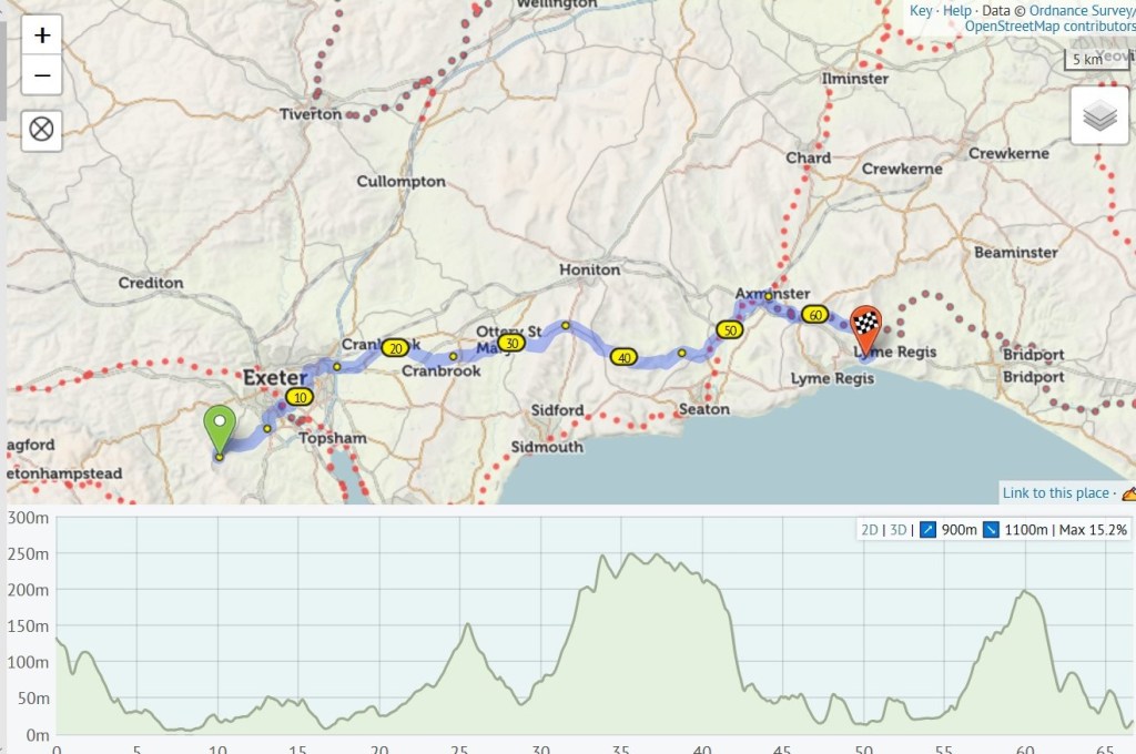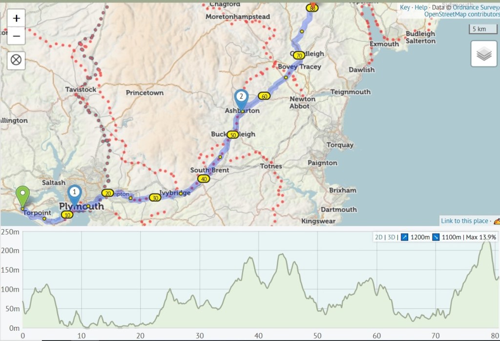 Today’s route, 10 km in Cornwall, the rest in Devon. The last climb was a killer (followed by a short descent), I deserved my hot bath and large cup of tea.