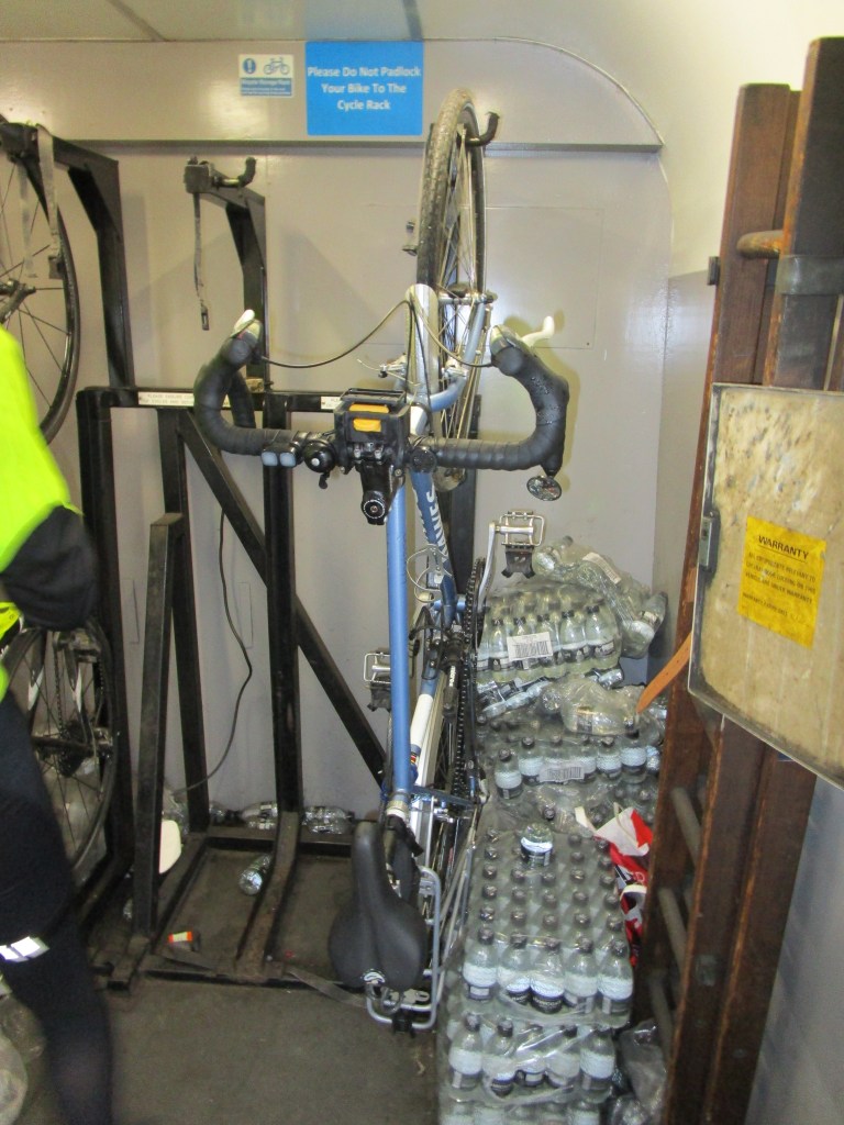 Then a short negotiation to get the bike into the guard’s van – I am not sure if he was having 40 winks when I knocked on his door but he looked startled! Bikes hang vertically next to the water!