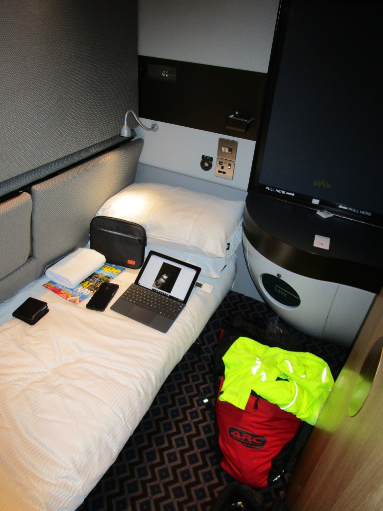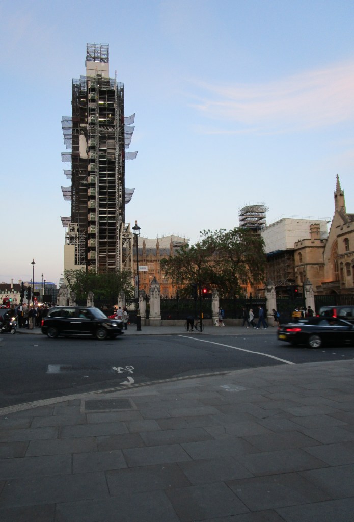 The nice Garmin navigation machine took me across London past a few notable highlights. These included the old with the new (Tower of London with the Shard), a completely boarded up Big Ben – a metaphor for our current political system if there ever was one – in dire need of rejuvenation and repair. I cannot help feeling that our ancestor, Oliver Cromwell, might well have had a few words to say…. Then past Buck House – good to see that Madge was in residence. Eventually I ended up at Paddington station where I had to wait a bit before being allowed to take my berth on the sleeper. Total distance on this ride: 13.4 km, running total: 23.3 km. One accident.