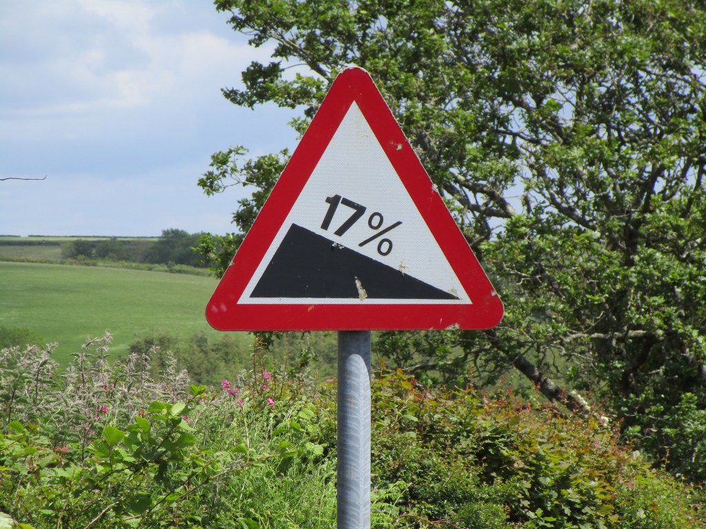 Anyway, yesterday was a day that I had not looked forward to due to the number of hills on my route – see below. These are sharp and brutish – I only found one sign indicating gradient and that was on one of the easier hills. I did a fair bit of pushing! Going downhill was not that easy either as I had to be gripping my brakes all the way, with a fair bit of squealing (the centre of most lanes is loose gravel on tarmac, anmd I was not keen to go there)