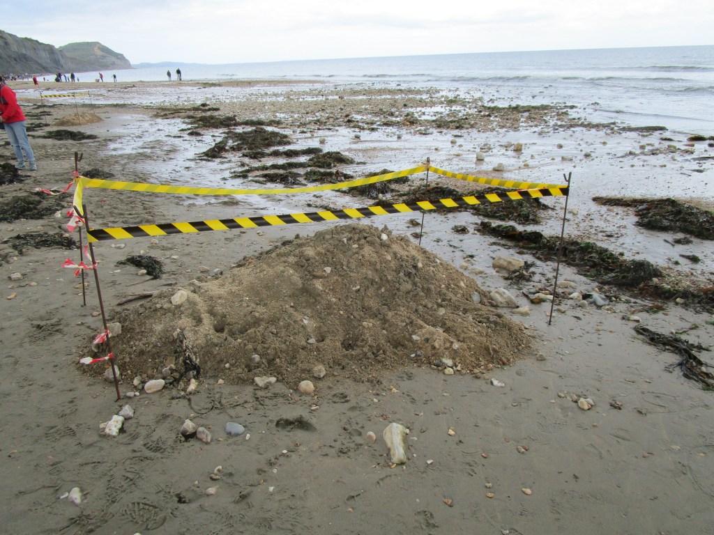 My JNCC job persists… the site of the burial of a heavily decomposed “dolphin” (in the background, site of a dead seal). We talked to the beach superintendent who decided wisely to bury the smell before the arrival of the crowds this morning.
