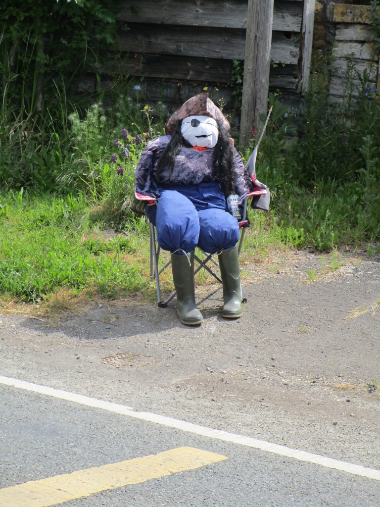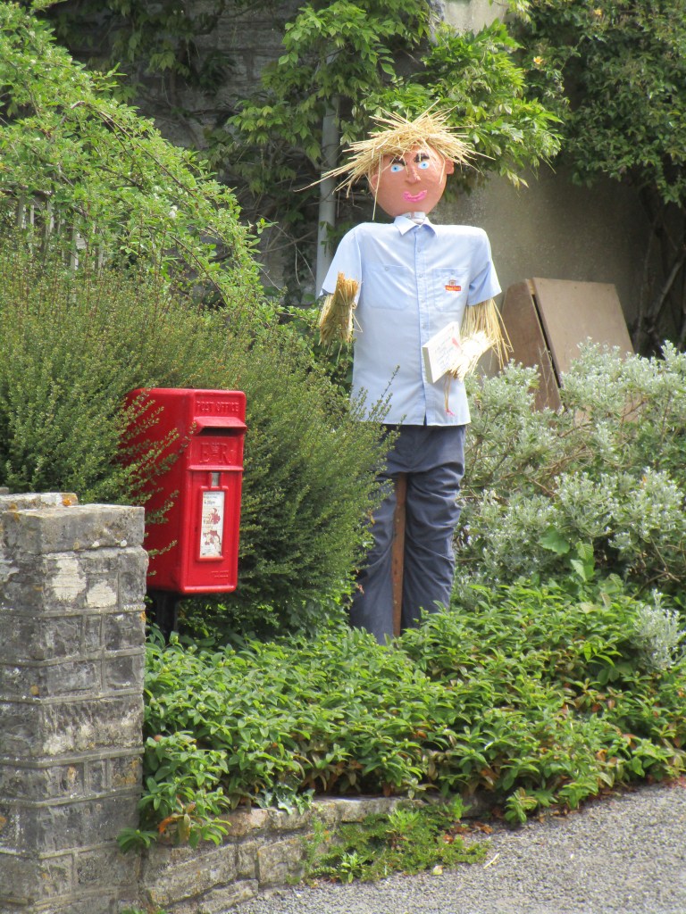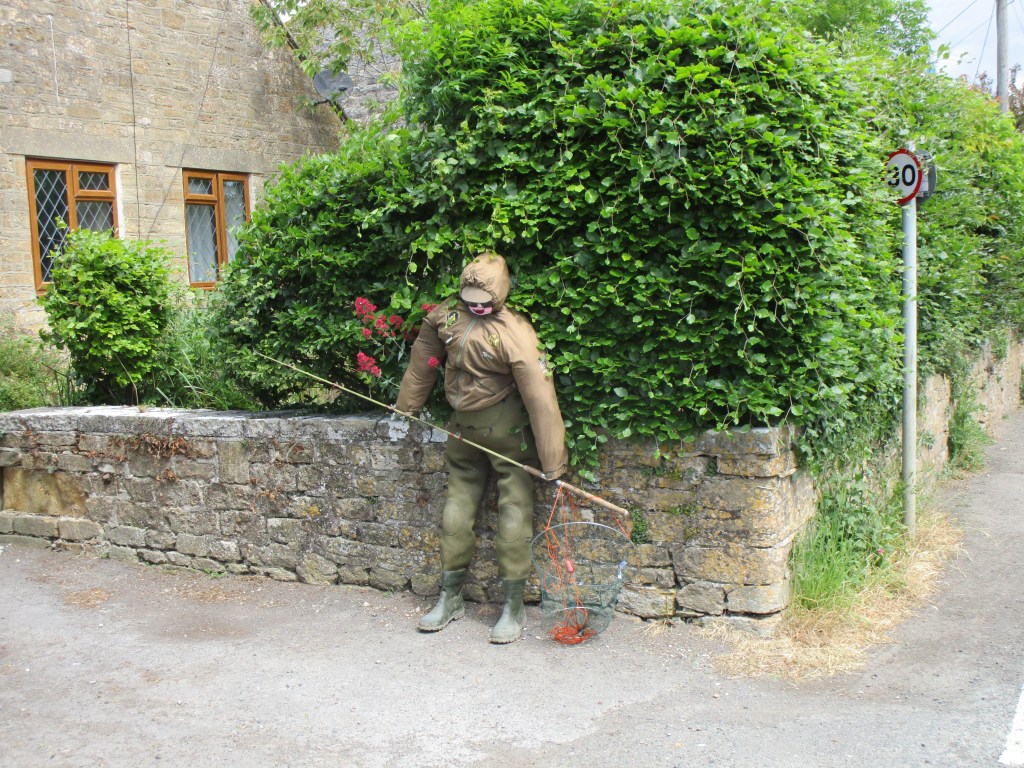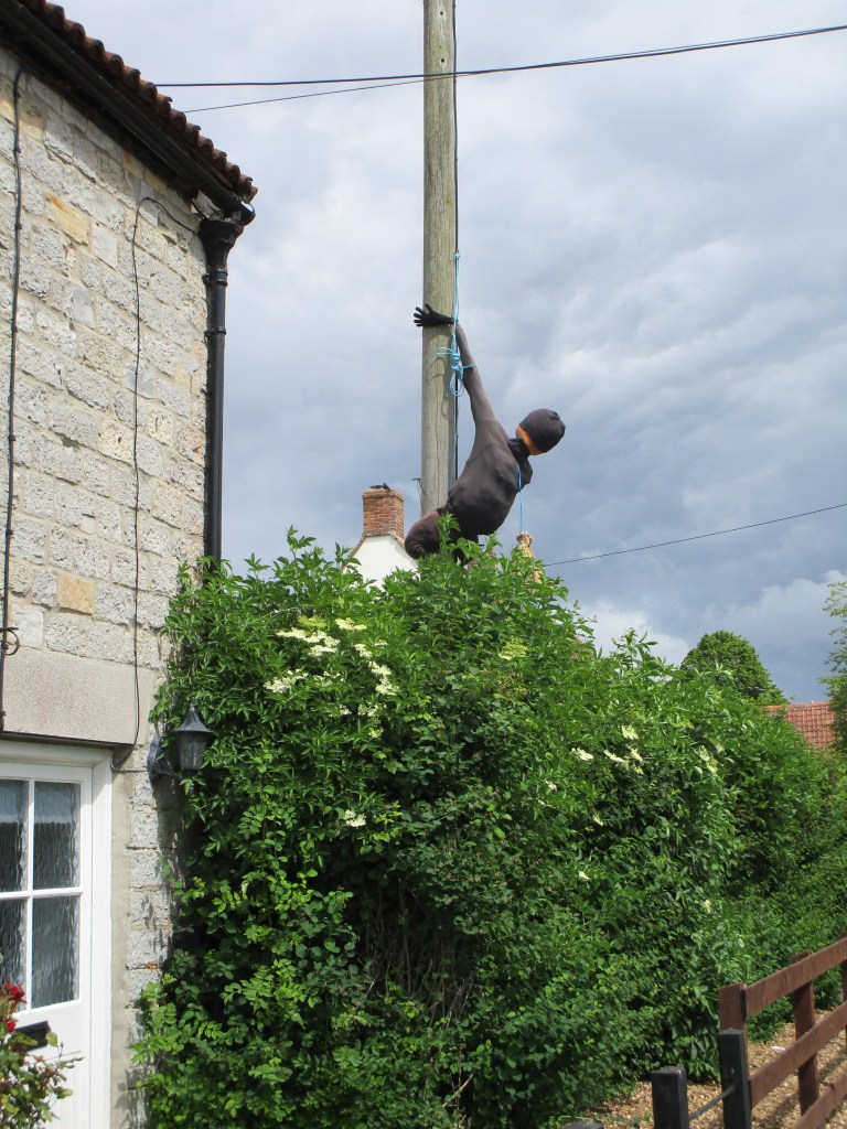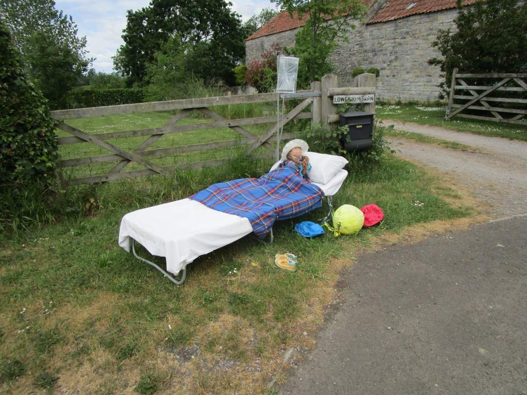Today was (as they say) one of two halves. It was a relatively short ride to my cousin’s house in Somerton (the ancient capital of Wessex – learned from the town sign on the way in). The route took me through some fine rural agricultural landscape, and onto a section of road closed for repairs. Not knowing what the diversion looked like, I negotiated to walk past the road-menders who had ripped up all the tarmac for about 1 km and were also replacing the manhole covers etc in the road. This was excellent as I had about 3 km of B road completely to myself. Towards the end I came to the village of Long Load (I imagine there are many jokes) where most front gardens had some sort of scarecrow/guy in attendance. Here are just a few of those.