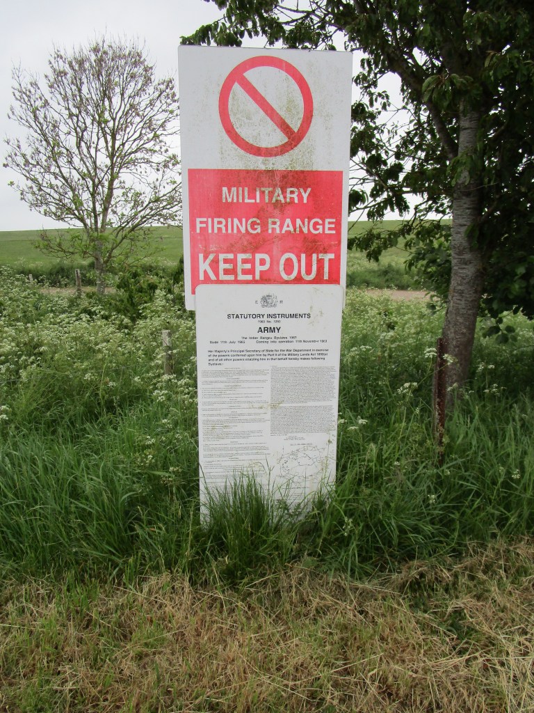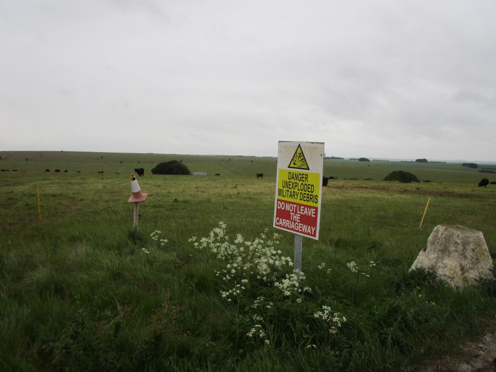 So I figured that they would man the check-point if they really meant NO… and carried on. I waved to some nice men in Army uniforms, who took no notice; I sped past a couple of very mean looking Army trucks and was interested to hear small arms fire to my left and very heavy shell fire to my right (both out of sight) and after about 9 km emerged on the other side just fine. The chalk downland in the ranges looked brilliant and some was being grazed by cattle held in by electric fences. It was sad that the weather was so wet (and cold) as there were no butterflies out – I was really hoping to see a few of chalk specialities today.